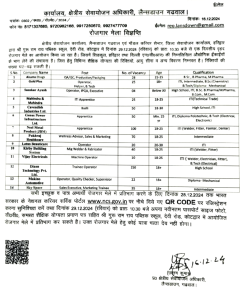 उत्तम कुमार ने बताया कि रोजगार मेले में प्रतिभाग करने वाले युवाओं को 28 दिसंबर तक भारत सरकार के नेशनल करियर सर्विस पोर्टल www.nsc.gov.in पर दिए गए क्यू आर कोड पर पंजीकरण कराना अनिवार्य होगा।
