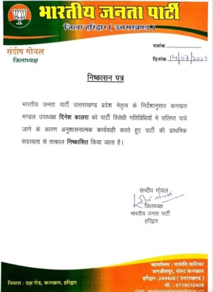 हरिद्वार — भारतीय जनता पार्टी के जिलाध्यक्ष संदीप गोयल ने प्रदेश नेतृत्व के निर्देश पर कनखल मण्डल उपाध्यक्ष दिनेश कालरा को पार्टी से निलंबित कर दिया है। फोन पर पार्टी विरोधी गतिविधियों में शामिल होने का आरोप लगा है। आपको बता दें कि दिनेश कालरा के गोदाम से विधानसभा चुनाव में शराब बरामद होने के बाद चर्चाओं में आए थे । आरोप भले ही पार्टी विरोधी गतिविधियों का हो लेकिन चर्चा गुरुवार को मुख्यमंत्री के लक्षण दौरे से जोड़कर हो रही है।