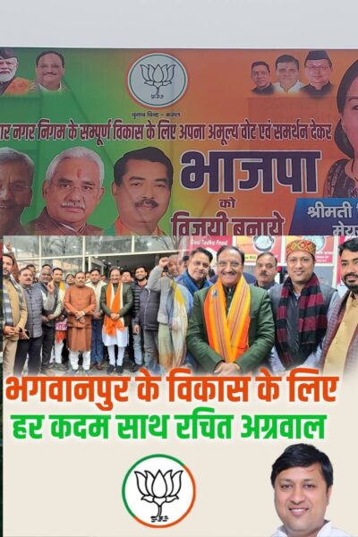 भगवानपुर नगर पंचायत से भाजपा के उम्मीदवार रचित अग्रवाल के चुनावी पोस्टर में निशंक नजर आ रहे है। जबकि त्रिवेंद्र को पोस्टर में जगह नही दी गई।