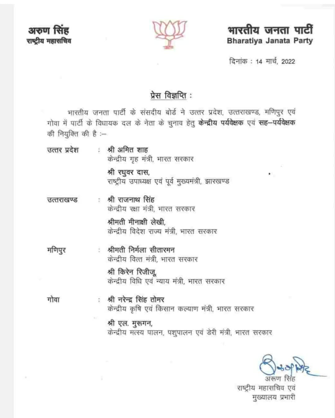 राष्ट्रीय महासचिव अरुण सिंह द्वारा 4 राज्यों के लिए पर्यवेक्षको की सूची जारी कर दी गई है।