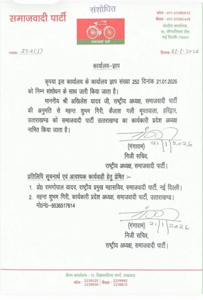 महंत शुभम गिरी को अखिलेश यादव ने उत्तराखंड के कार्यकारी प्रदेश अध्यक्ष की जिम्मेदारी दी है।