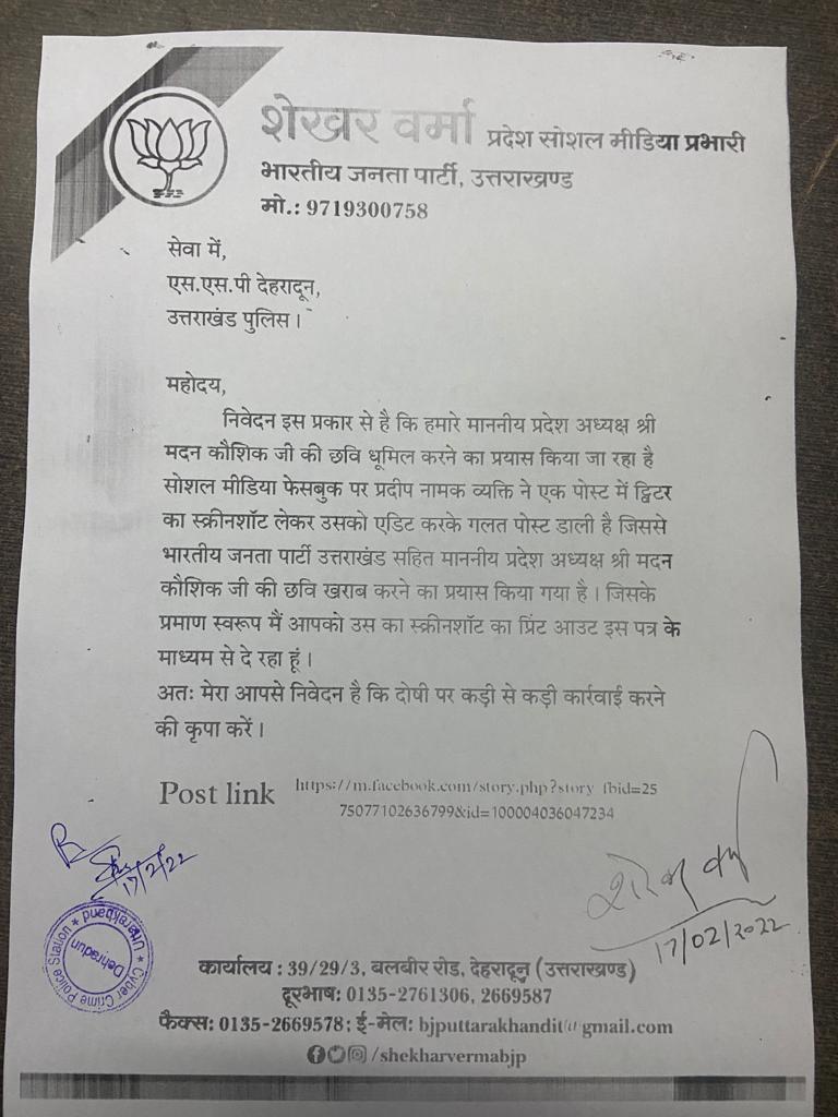 जिसके बाद राजनीतिक गलियारों में चर्चाएं तेज हो गई थी उत्तराखंड बीजेपी के प्रदेश सोशल मीडिया प्रभारी ने देहरादून एसएसपी को पत्र लिखकर प्रदीप नाम के व्यक्ति के खिलाफ कार्रवाई करने और प्रदेश अध्यक्ष की छवि धूमिल करने के आरोप के साथ कार्रवाई की मांग की है।
