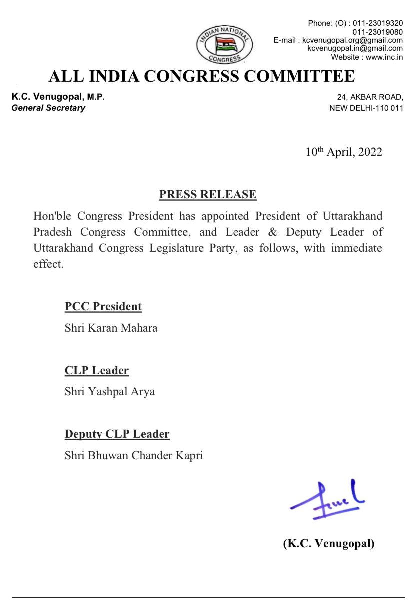 करण माहरा होंगे नए प्रदेश अध्यक्ष, जबकि यशपाल आर्य को बनाया नेता प्रतिपक्ष