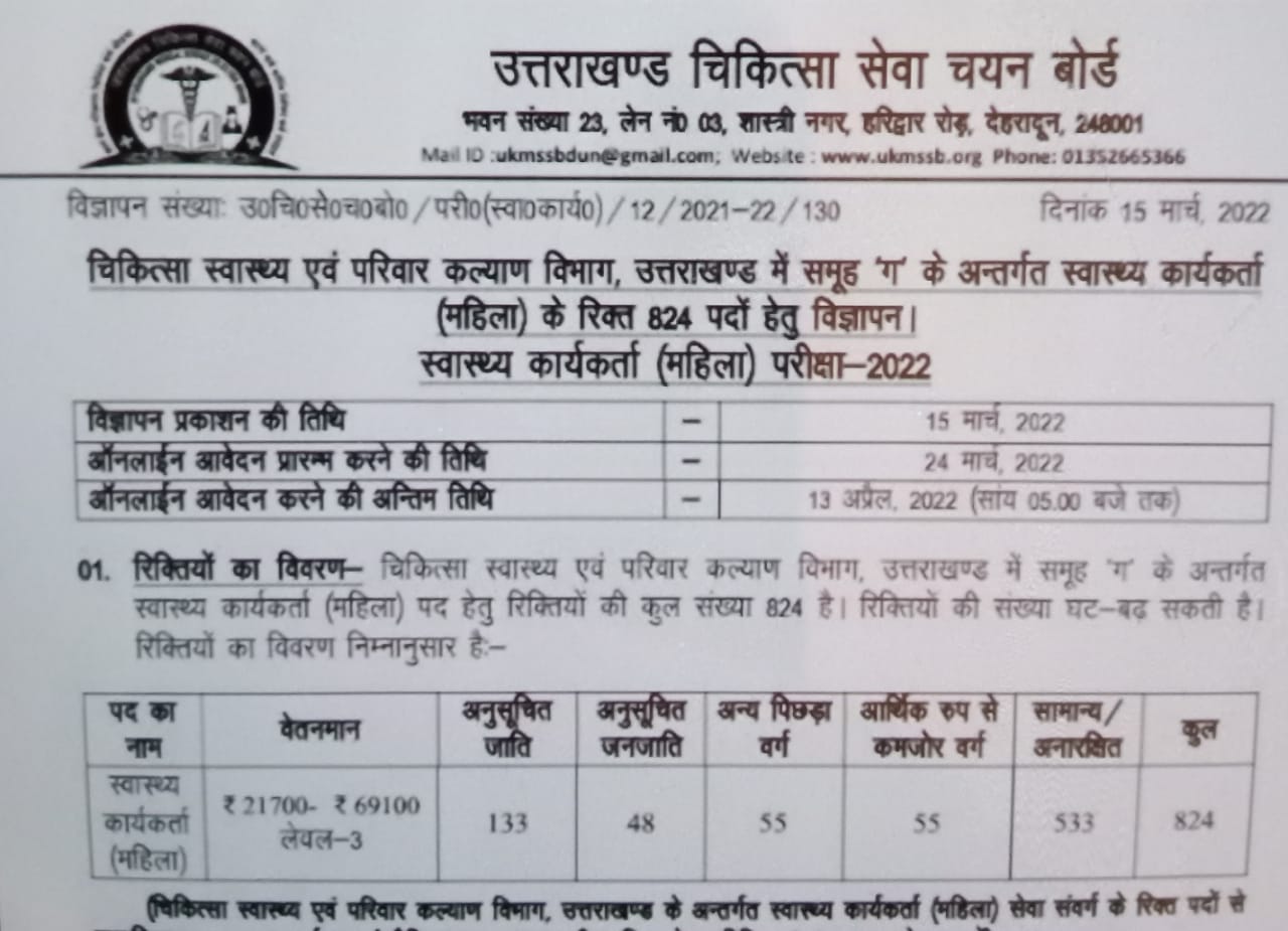 उत्तराखंड में जॉब करने के इच्छुक अभ्यर्थियों के लिए अच्छी खबर-समूह ग के तहत स्वास्थ्य कार्यकर्ताओं के 824 पदों पर सीधी भर्ती के लिए आवेदन मांगे जा रहे हैं।