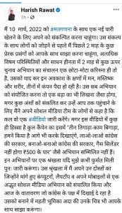हरीश रावत ने सोशल मीडिया पर ट्वीट कर कहा कि 10 तारीख तक चुनाव परिणाम आने से पहले वे अपने उन्हीं सभी साथियों को धन्यवाद देंगे जिन्होंने मांगे हुए कंप्यूटर और मोबाइल से सोशल मीडिया पर काम किया और जिन्होंने अलग-अलग क्षेत्र में काम करते हुए कांग्रेस की रीति और नीति को उत्तराखंड में जन जन तक पहुंचाने का काम किया है हरदा ने 10 मार्च तक सोशल मीडिया पर इस मुहिम को जारी रखने की बात कही है।
