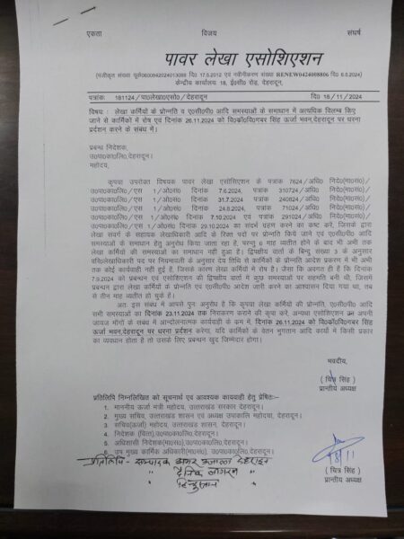 ऐसे में एसोसियशन ने चेतावनी देते हुए कहा है यदि सभी मांगो का निस्तारण शीघ्र नही किया जाता तो 26 नवंबर को ऊर्जा भवन, देहरादून पर धरना प्रर्दशन किया जाएगा।