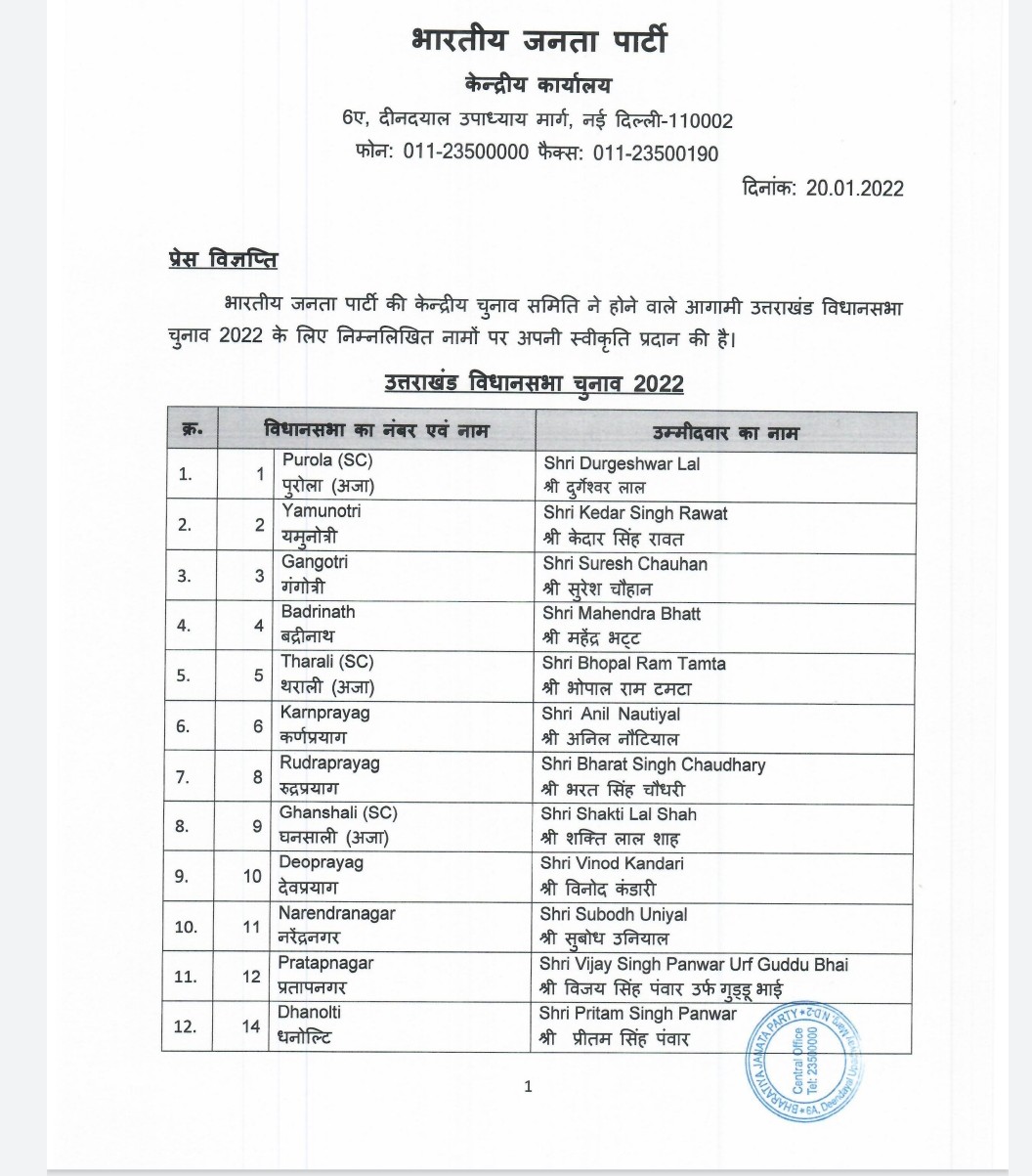 प्रदेश चुनाव प्रभारी प्रह्लाद जोशी ने गुरुवार को पत्रकार वार्ता में 59 सीटों पर उम्मीदवारों के नामों की घोषणा की। वहीं मुख्यमंत्री पुष्कर सिंह धामी खटीमा सीट से चुनाव लड़ेंगे। बची 11 सीटों पर बाद में नामों का एलान किया जाएगा। इस बार पांच महिलाओं को इस बार टिकट दिया गया है। वहीं 13 ब्राह्मण नेताओं को टिकट दिया गया है।