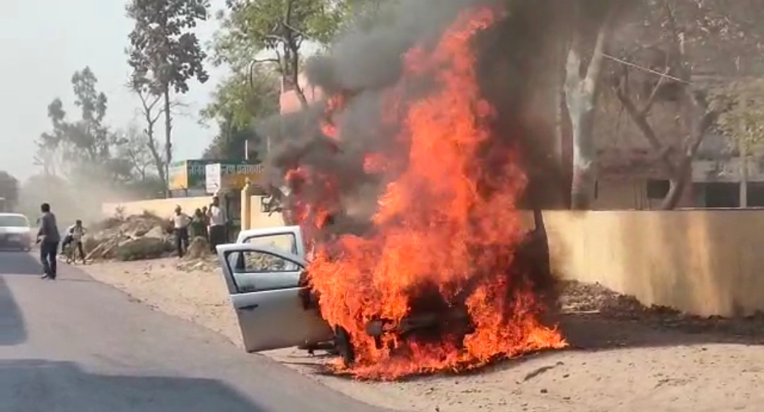 National Highway पर चलती हुई कार बनी आग का गोला,बाल बाल बचे कार सवार-